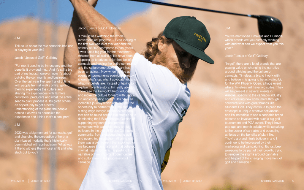 “In golf, there are a lot of brands that are placing value on changing the narrative around athletes and the culture of cannabis. Timeless, a brand I work with and believe in is going to be activating big for the WM Phoenix Open, a huge event where Timeless will have two suites. They will be present at several events in Arizona, specific to the cannabis industry and educating new consumers through collaborations with great brands like Students Golf. They continue to push the envelope in unique creative activations and it’s incredible to see a cannabis brand become so involved with such a big golf tournament and PGA event. They’ll have pop-ups and merch collabs while speaking to the power of cannabis and educating athletes on the benefits of plant life. They’re a brand I truly believe in and I continue to be impressed by their marketing and campaigning. It’s just been awesome to be part of their growth, trying to remove the stigma around cannabis and be part of the changing movement of golf and cannabis.”