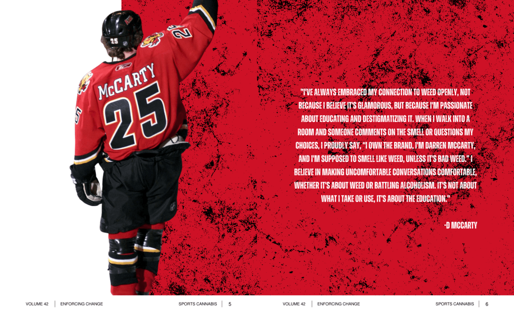 “The most misunderstood and stigmatized aspect of weed when I played in the NHL, especially back then, was what happened to you when you used it compared to other substances. It doesn’t make sense that a person could receive more criticism for using weed for pain or stress than someone would for injecting a needle into their butt. You know, alcohol is widely accepted in the NHL still to this day, but the weed conversation has always been swept under the rug. I’ve always embraced my connection to weed openly, not because I believe it’s glamorous, but because I’m passionate about educating and destigmatizing it. When I walk into a room and someone comments on the smell or questions my choices, I proudly say, “I own the brand, I’m Darren McCarty, and I’m supposed to smell like weed, unless it’s bad weed.” I believe in making uncomfortable conversations comfortable, whether it’s about weed or battling alcoholism. It’s not about what I take or use, it’s about the education.”