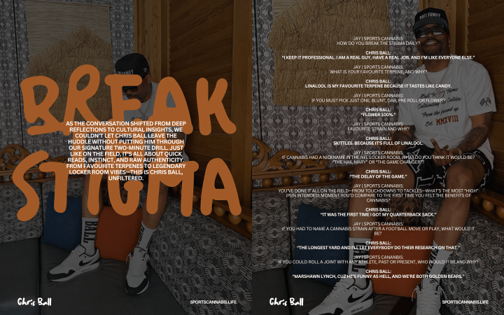 As the conversation shifted from deep reflections to cultural insights, we couldn’t let Chris Ball leave the huddle without putting him through our signature two-minute drill. Just like on the field, it’s all about quick reads, instinct, and raw authenticity. From favourite terpenes to legendary locker room vibes—this is Chris Ball, unfiltered.